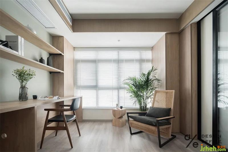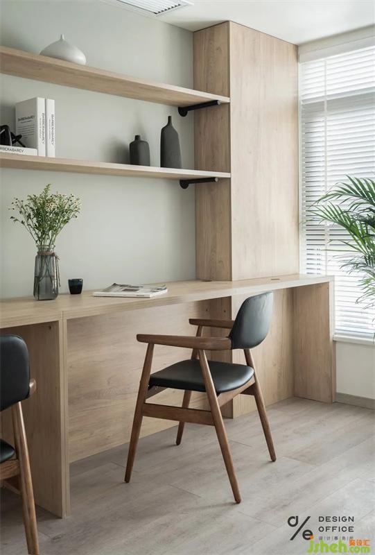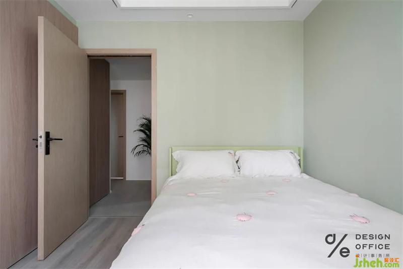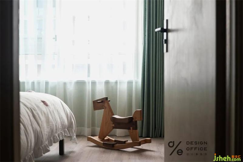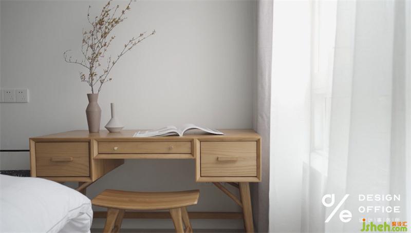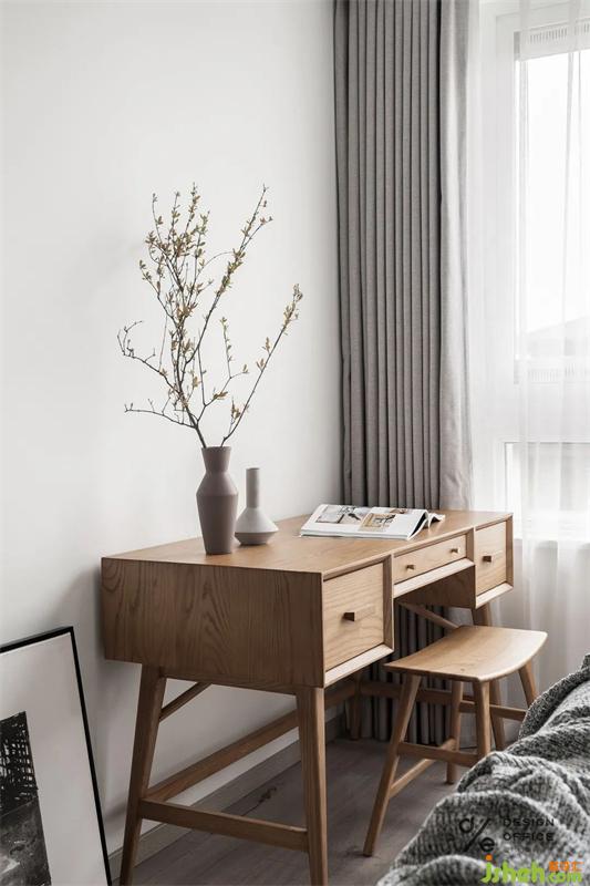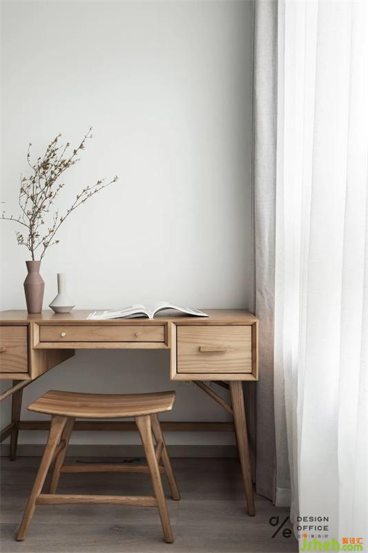 棉麻感的窗簾和床品呼應(yīng),柔和白色的單調(diào)。房間角落的桌面與衣柜做了融合,添上一張椅,又多了一處安靜的庇護(hù)所。