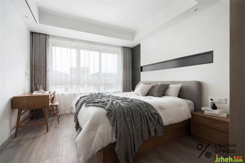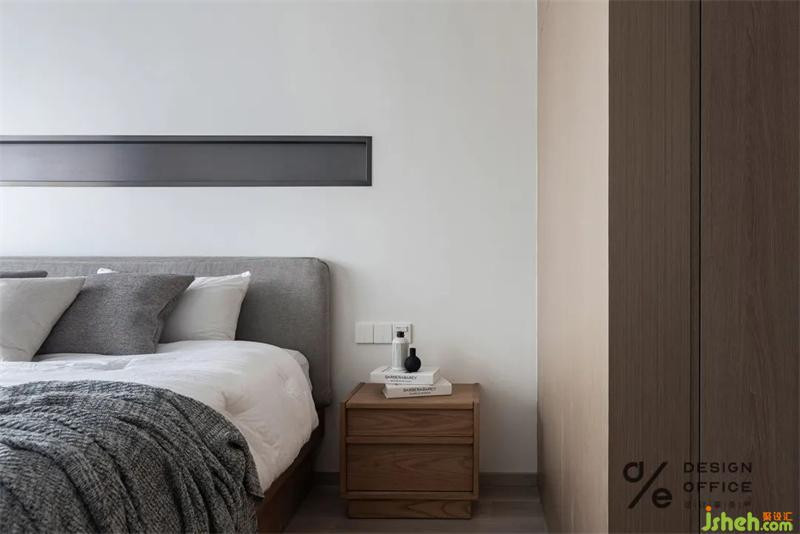臥室墻面是干凈的素白,深木色的床與邊柜加以點(diǎn)綴,中和白色的輕盈。