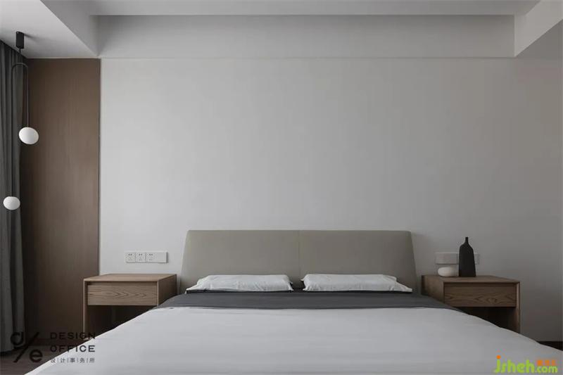 設(shè)計(jì)師希望臥室是干凈純粹的地方,不需要過(guò)多的造型來(lái)體現(xiàn)華麗感,追尋簡(jiǎn)單,通過(guò)燈帶、床頭吊燈、床頭燈來(lái)烘托溫馨氛圍。