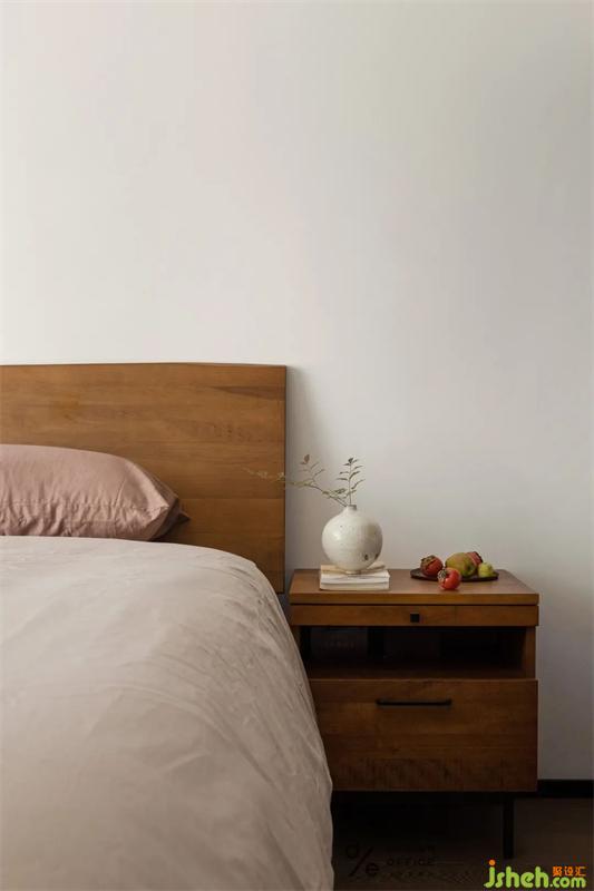 把公區(qū)自然舒適的狀態(tài)延續(xù)到臥室當(dāng)中,墻面沒有做過多的修飾,更多去關(guān)注的是生活化的一些場景。所以選用了跟公區(qū)風(fēng)格一致的原木床,搭配素色床品,充滿韻律感,細膩而耐看。