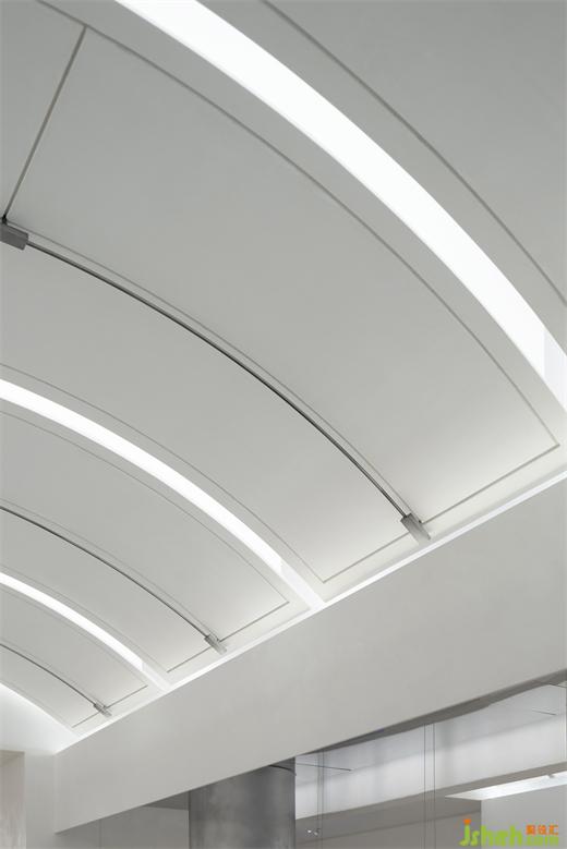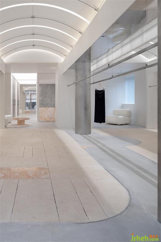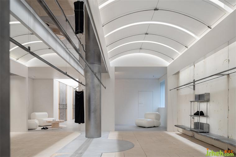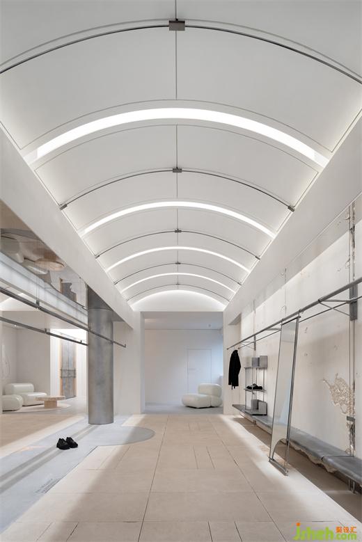 入口的弧形石材門框,是對“裁剪”運動軌跡的提?。婚T把精細穿插的結(jié)構(gòu),展廳設(shè)計是對“縫紉機”穿針引線的表達。細微之處,關(guān)于品牌精神的具象探索,正逐一展開。