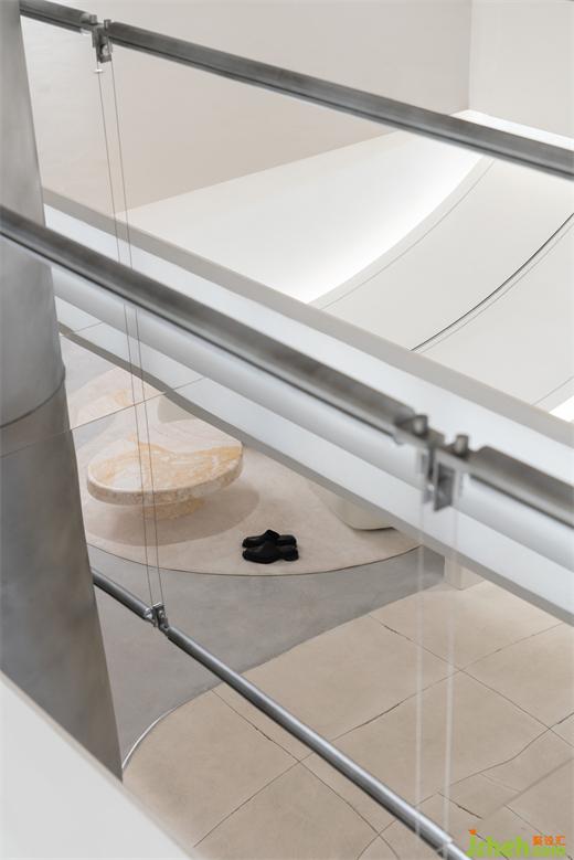隨著步伐的移動,階梯上金屬凳的邊緣內(nèi)折,是對“紙樣”輕薄質(zhì)感的轉(zhuǎn)譯;