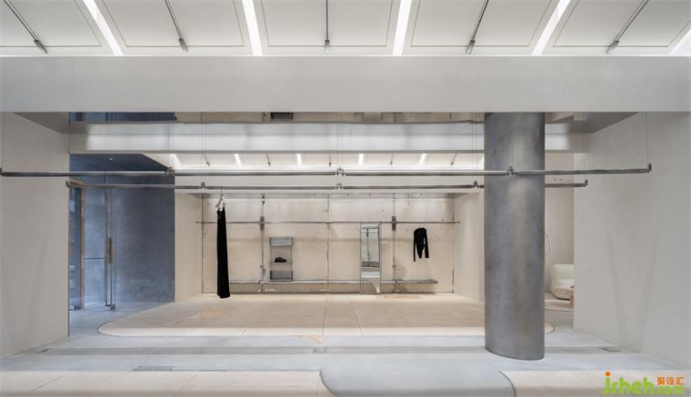 AVVENN是以女性為主導(dǎo)的品牌。原本的方形柱子以金屬板包裹成圓柱,空間愈加柔和。女性之美,不止于柔,更在于表象之下的內(nèi)在力量。以三角形的形態(tài)進(jìn)行的穿插固定,線條干凈利落,更寓意著現(xiàn)代先鋒女性的強(qiáng)大內(nèi)核,呈現(xiàn)出整體的剛?cè)岵?jì)。