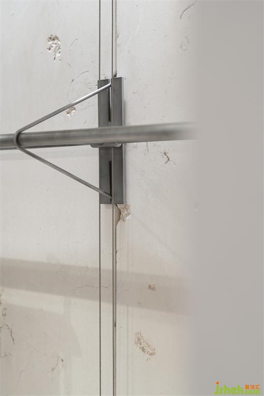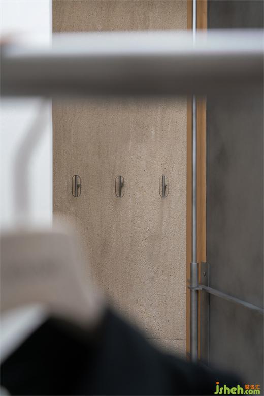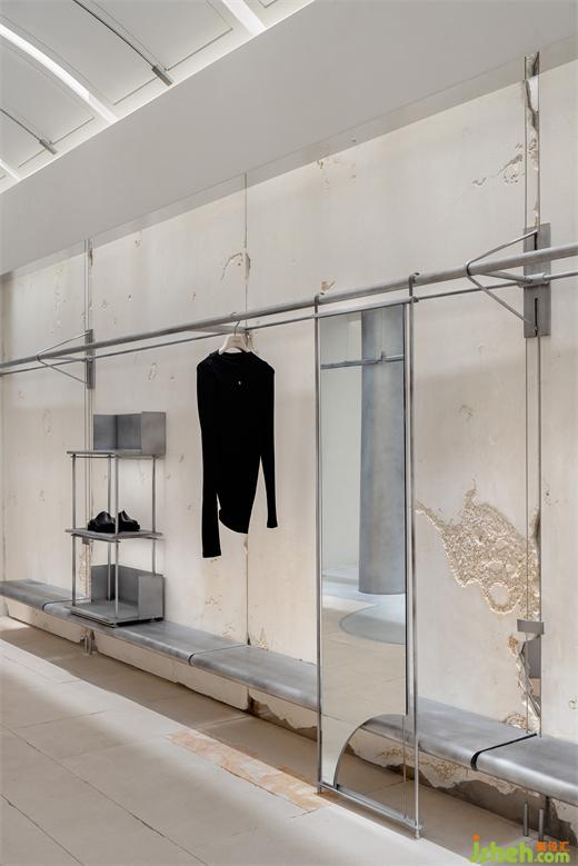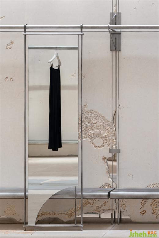 依附墻邊的掛衣系統(tǒng),穿插、連接、交疊是對(duì)制衣過(guò)程中穿針引線瞬間的藝術(shù)化再現(xiàn),仿佛見(jiàn)證了一塊布料到一件服裝的蛻變。