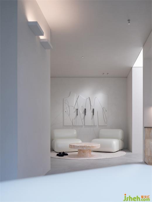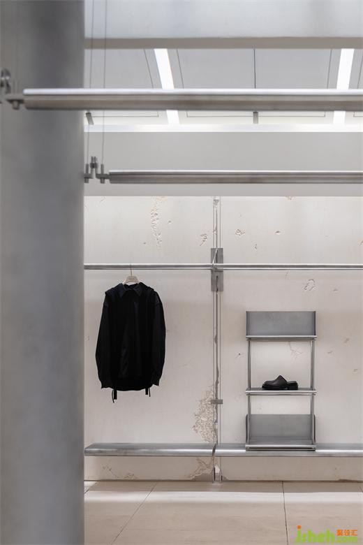 肌理是空間的情緒。大面積的白,掙脫規(guī)則的束縛,賦予了更多自由的想象。手工雕琢的蟲(chóng)洞石墻面如大自然的筆觸,看似隨意,卻在靠近時(shí)輕而易舉地牽動(dòng)著細(xì)微情愫。每一件服飾有如獨(dú)立的藝術(shù)品,給予來(lái)訪者足夠的空間觀賞。