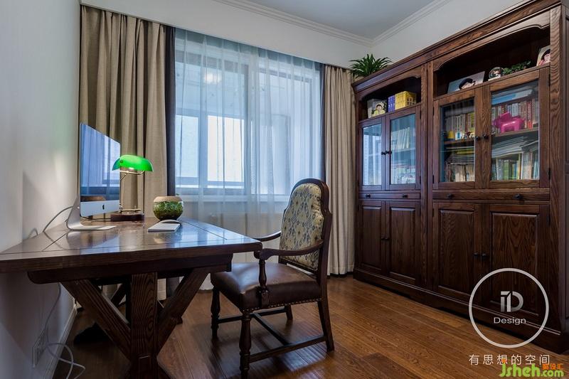 室內(nèi)設(shè)計(jì)師在書房選用了沉穩(wěn)的美式原木色,想營造安靜的空間環(huán)境,讓愛看書的男業(yè)主能夠靜下心來做自己的事情。