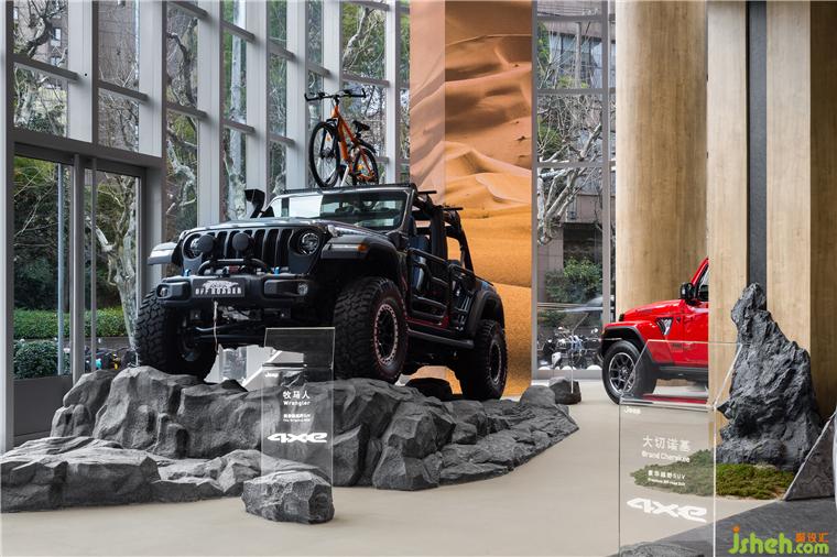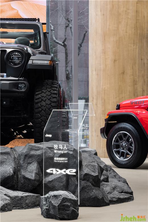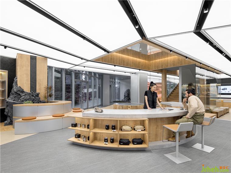 天花燈膜和兩階的抬高明確了“集結(jié)地”的范圍,也讓整體空間更加向中心聚焦。Jeep探享中心設計作為中心服務區(qū),這里承載了Jeep的服務島臺、洽談,以及品牌周邊衍生品展示的功能。