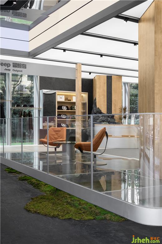 “內(nèi)部建筑”的置入,使得整體門店空間呈現(xiàn)出內(nèi)外互觀的空間視覺關系。Jeep探享中心設計場景化的空間設計使得一切功能的置入更加流暢。空間中出現(xiàn)的座椅不再呈現(xiàn)一種“洽談區(qū)”的姿態(tài),而是露臺上休憩小坐的地方。同時,空間屬性的變化也改變著銷售與顧客的交談氛圍。