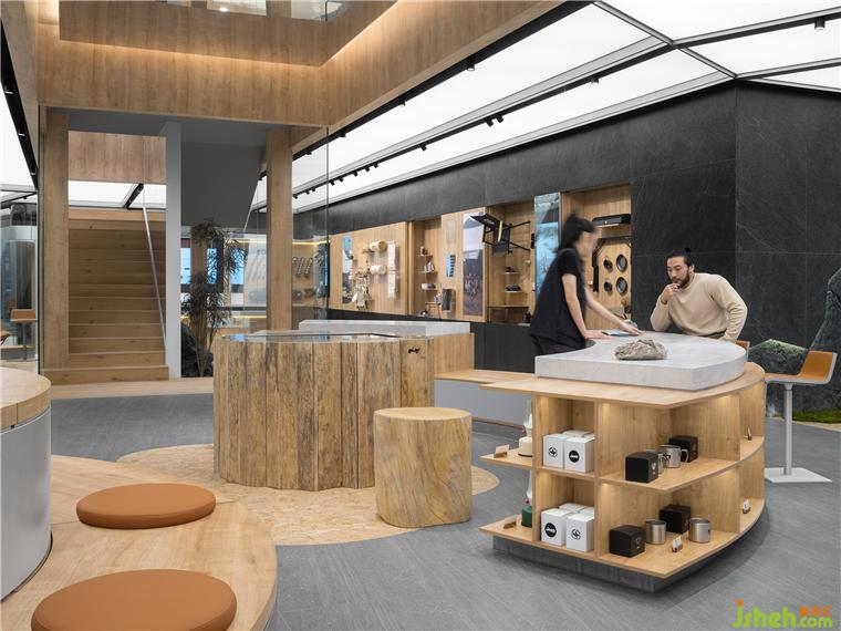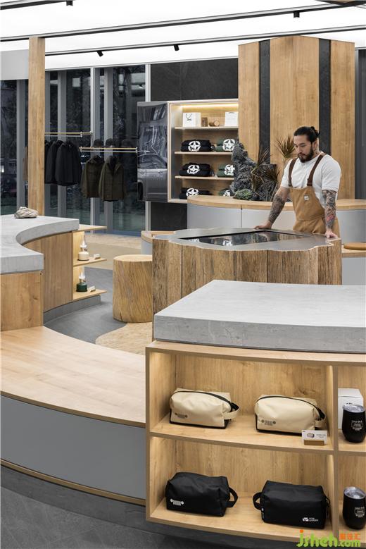 通過原始且環(huán)保的材質(zhì)運用,INGROUP嘗試在空間中加入豐富的自然肌理——石粉和永生苔蘚打造穿插在空間中的山體意象;數(shù)字化展示體驗桌面結(jié)合回收的老木門板,模仿大樹樁的古樸姿態(tài);地面局部區(qū)域使用歐松板,天然材料壓合的質(zhì)感讓其上的老木臺更好地融合在空間中。
