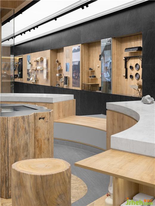 在環(huán)島展示臺(tái)后面設(shè)有通往空間二層的樓梯,樓梯下方空間形成了對(duì)自然外部的櫥窗化展示,地面的土壤、苔蘚和植物,與空間中人造的質(zhì)感形成了反差。透明玻璃幕墻使視線更通達(dá)的同時(shí),也和一側(cè)的框景有著材質(zhì)上的呼應(yīng)。