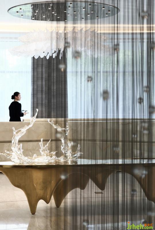 垂感十足的細密晶體似無數(shù)顆流星至天頂串起,直線流墜入中央展示區(qū)域,映照滿堂的光輝燦爛, 如天邊星輝云系,劃過地界之邊。