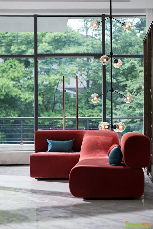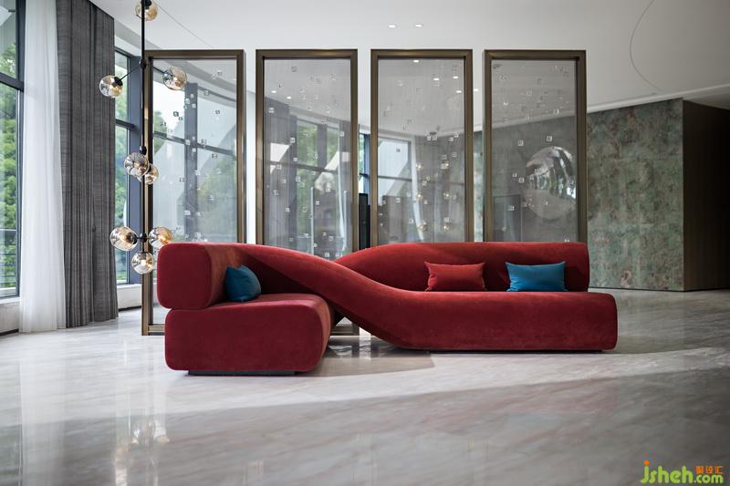 作為這里主視覺的當代雕塑“天鏡”,奇特的金屬視覺質(zhì)感畫龍點睛,與整個氛圍一拍即合。洽談區(qū)室內(nèi)設(shè)計師用定制的極簡湖藍色皮革沙發(fā)碰撞金屬底座,搭配個性時髦的波紋地毯彰顯精致品位。
