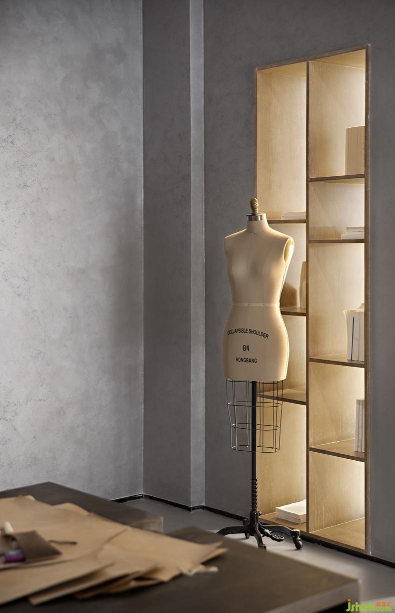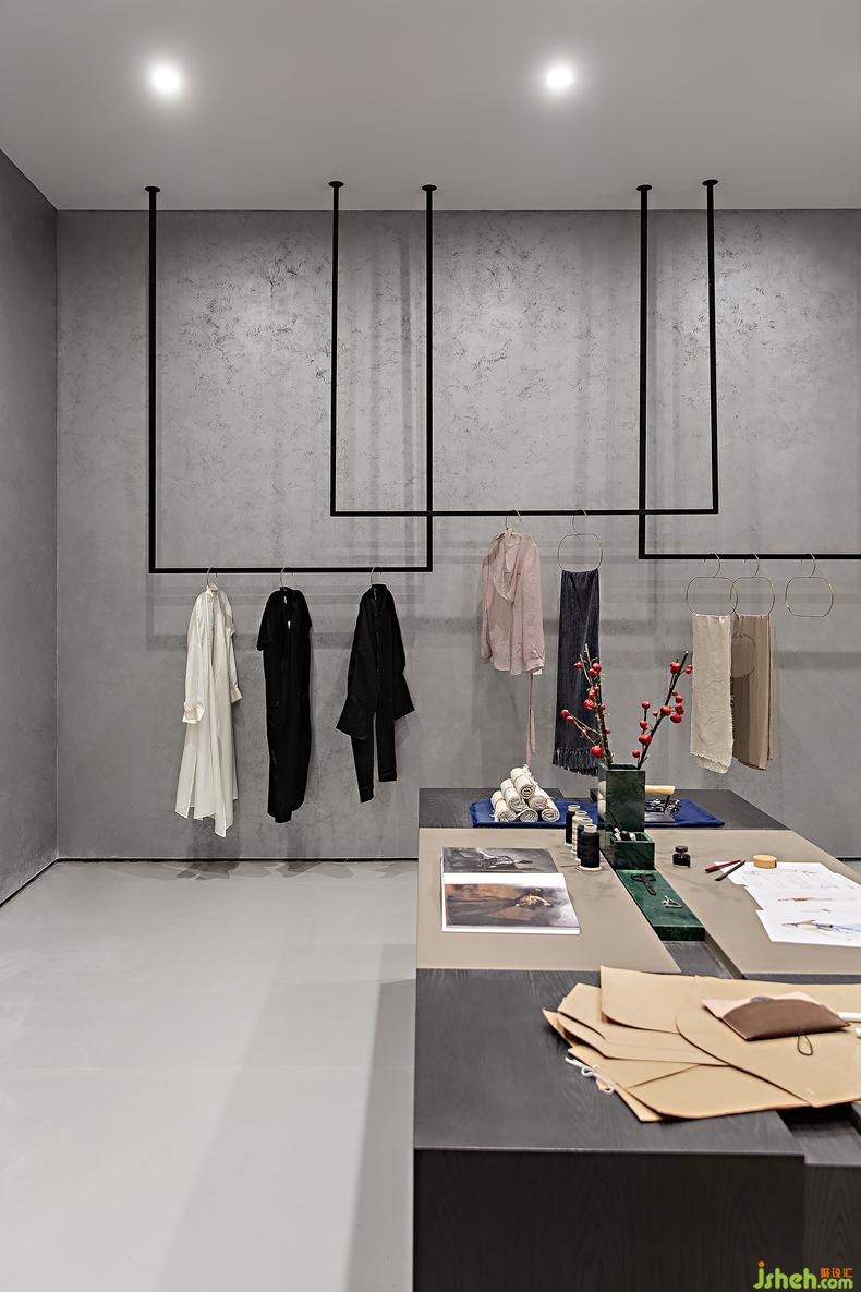 特意為女主人設(shè)計的一間工作室,糅合了現(xiàn)代的極簡形制與東方的清冽秀氣。一方長桌與開放性的掛衣架構(gòu)設(shè)其中,唯一的點綴是幾枝冬青,空間顯得十分靜寧。