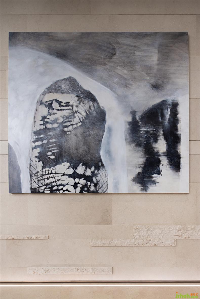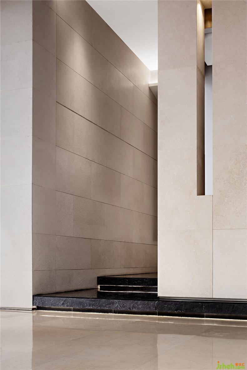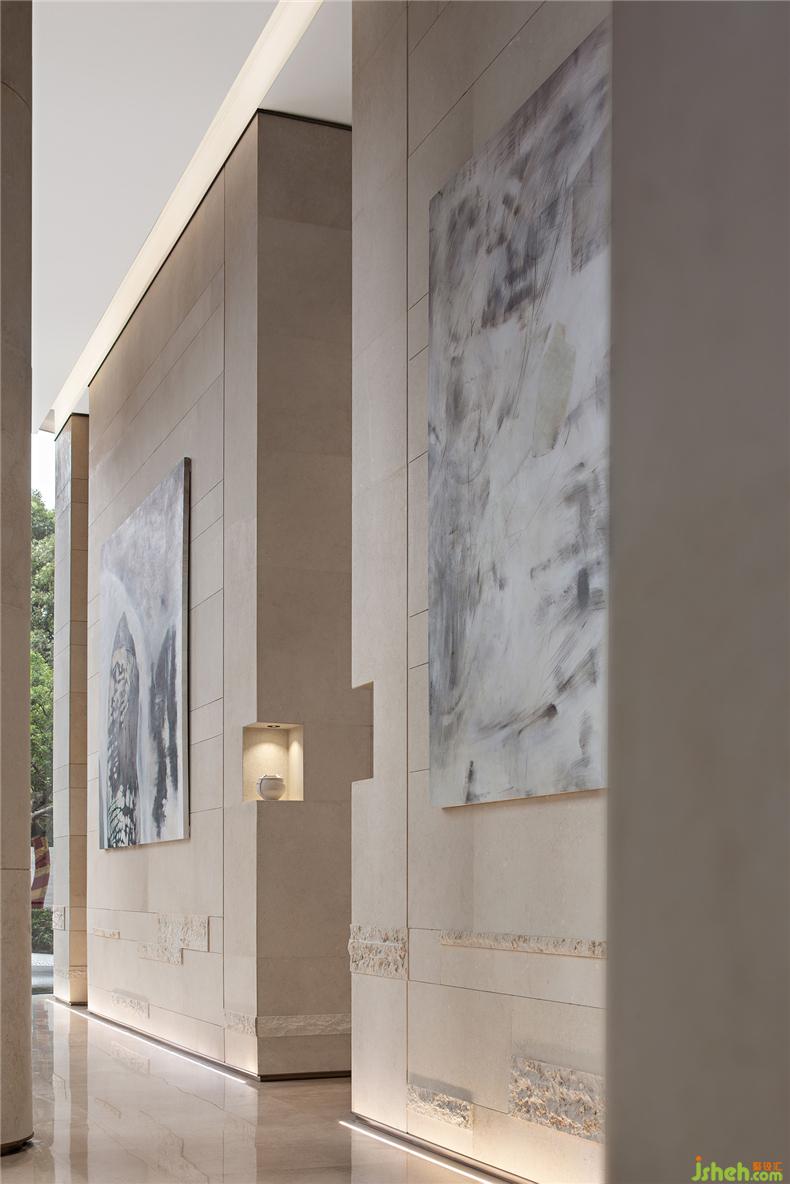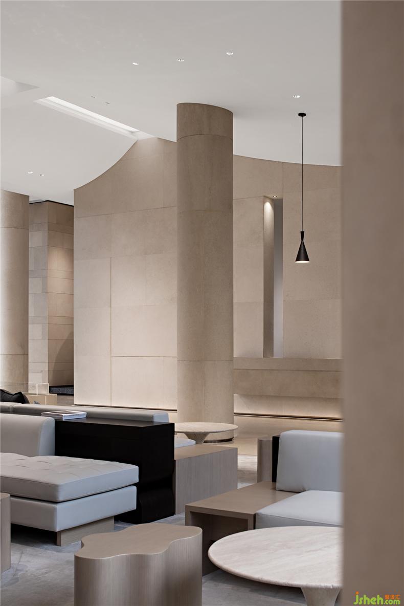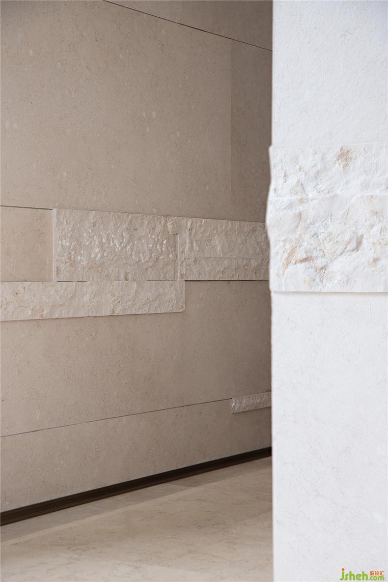 形式的混合通過限制使用材料和顏色來平衡。石材由溫暖的瑞士米黃斧鑿面和瑞士米黃大理石組成,售樓處裝修設計將整個空間中使用的中性色系聯(lián)在一起。該空間中賦予的其他顏色使所陳列物更具光彩