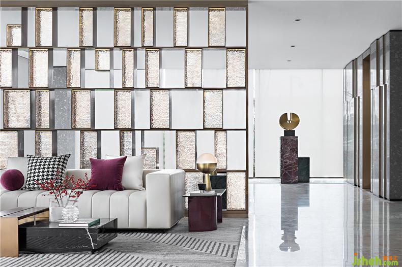 絨紅、灰白、雅棕是深談區(qū)的主色調(diào),金屬屏風(fēng)使得空間間隔卻未斷,室內(nèi)設(shè)計師柔和的光線折射其中,熠熠生動,清雅透亮。形制的簡潔,材質(zhì)的純粹,流麗與典雅滲透在洽談空間的每一處。