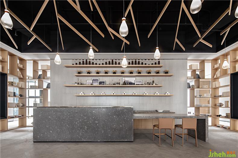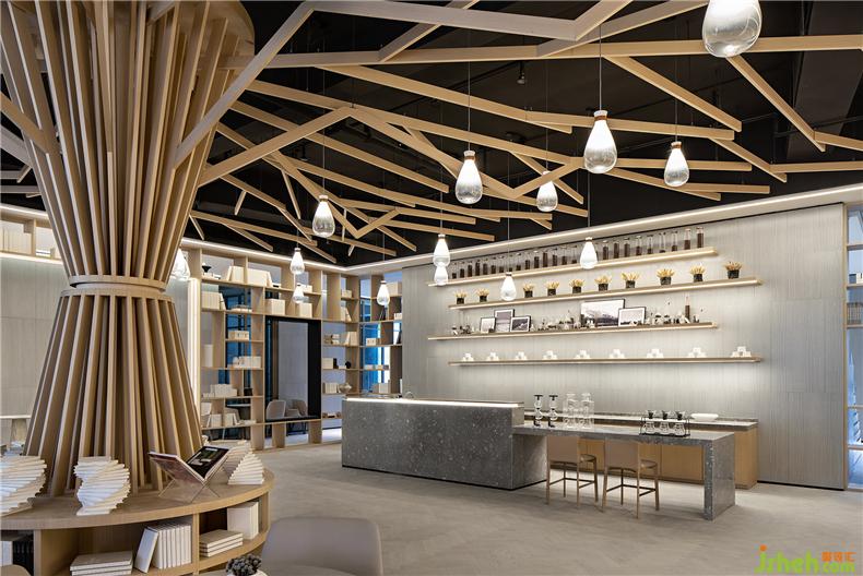 在休閑閱讀區(qū),設(shè)計師在室內(nèi)裝置著一株巨大的“樹”,室內(nèi)設(shè)計師將木的自然清氣融合到設(shè)計中,一顆顆熠熠的吊燈垂墜而下,像結(jié)落的果實,輕巧地點綴了空間的視覺重心,趣味盎然。