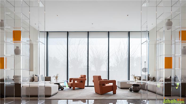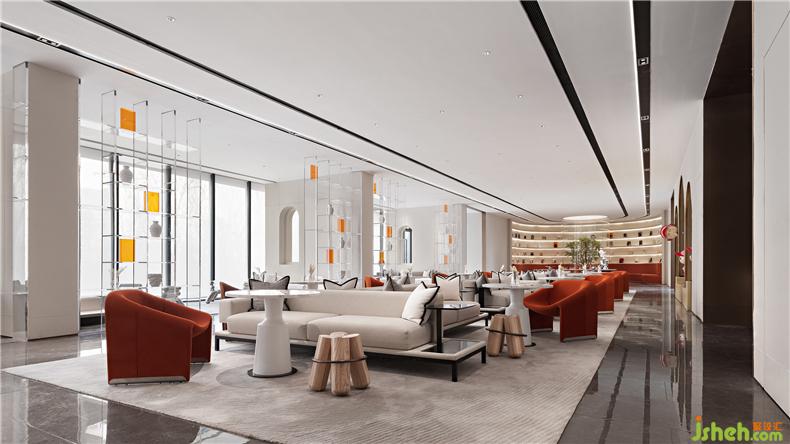 同時,亞克力與金屬結(jié)合的通高透明書架,使各個空間在隔而不離的同時,裝修設(shè)計營造了深度洽談區(qū)所需的安靜氛圍,書吧區(qū)是空間主題——“時光圖書館”,最為精華的所在,超大環(huán)型閱讀書架,以及各類不同的書刊,在尺寸不一的格架中向讀者呈現(xiàn),中間植物裝置將外界的自然引入室內(nèi),橙色軟體卡座沙發(fā)的代表“生機(jī)”與裝置呼應(yīng),富有儀式感的長方形閱讀活動桌,以及當(dāng)下主藝術(shù)作品,共同呈現(xiàn)了一處沉浸式的藝術(shù)閱讀區(qū)域。