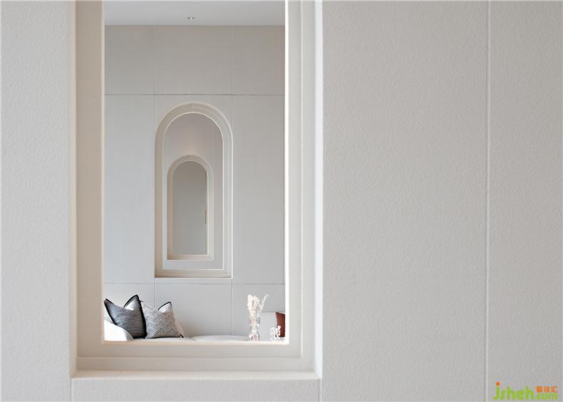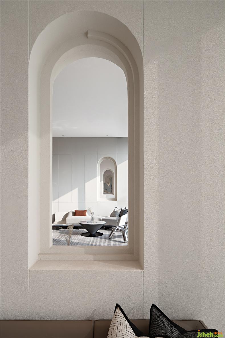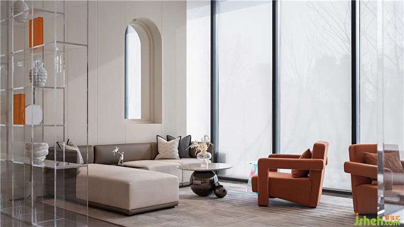 水吧區(qū)、淺談區(qū)與書吧區(qū)三處流線貫通,并在前后兩個區(qū)域成拱形狀圍合空間,水吧區(qū)色彩豐富,玻璃與金屬材質(zhì)的器皿相結(jié)合,用簡約的時尚感打造,符合當(dāng)下年輕人的精致生活方式與追求,淺談區(qū)空間延續(xù)了簡練的幾何線條特征,以及素雅而簡潔的色彩關(guān)系,并利用色調(diào)的深淺對比,和不同材質(zhì)所帶來的細(xì)膩感受來豐富空間的視覺層次,中部低矮的白色布藝沙發(fā)將空間的重心放低,營造出了適宜洽談的舒適氛圍,在午后陽光的映襯下,顯露出低調(diào)而雅致的品質(zhì)之感。