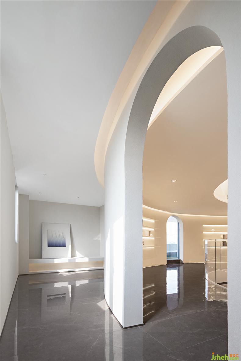 步入階梯,來到人居體驗館、藝術(shù)過廊,其主要功能除了承擔(dān)空間分流以外,延續(xù)空間的藝術(shù)體驗。人居體驗館容括了亳州遠(yuǎn)大當(dāng)代城MOMΛ品牌內(nèi)核,將共建人文、藝術(shù)的活力社區(qū)作為生活heng美。