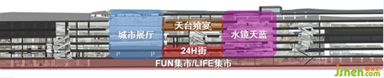 兩地塊連廊空間植入生態(tài)溫室的主題,創(chuàng)造自然環(huán)境與商業(yè)結(jié)合,購物廣場(chǎng)設(shè)計(jì)選用自然水元素呼應(yīng)運(yùn)河,打造城市展廳,將綠化空間串聯(lián),延伸至生態(tài)水岸,商業(yè)面跳動(dòng)的綠色植栽更增加項(xiàng)目生態(tài)感。