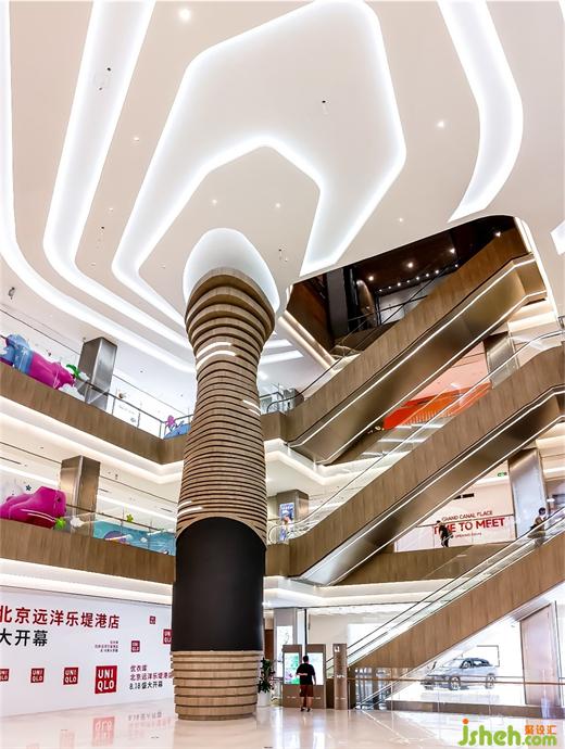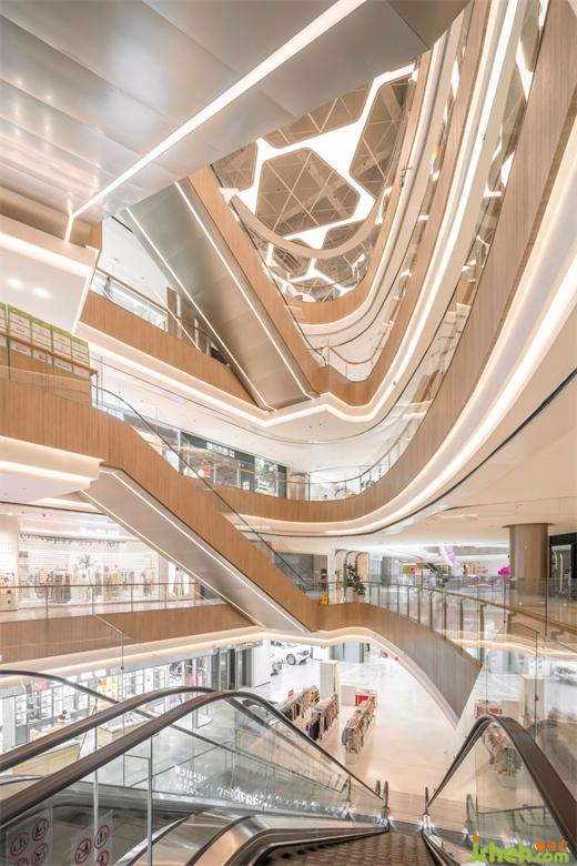 城市展廳以層疊漸退的形式,購物廣場(chǎng)設(shè)計(jì)將原有硬朗直線條調(diào)整為有一定弧度的方式,配合線型燈條的穿插增加柔美輕巧的流動(dòng)感。