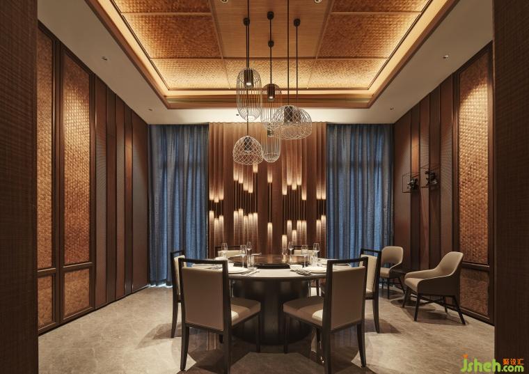 餐廳設(shè)計(jì)墻面巧妙融合了藤編與木雕技藝,配以仿藤編金屬網(wǎng)裝飾內(nèi)置木雕藝術(shù)作品,既彰顯了客莊鐵道文化與木雕藝術(shù)的獨(dú)特魅力,又凸顯了客家人宴客時(shí)的精致與考究。