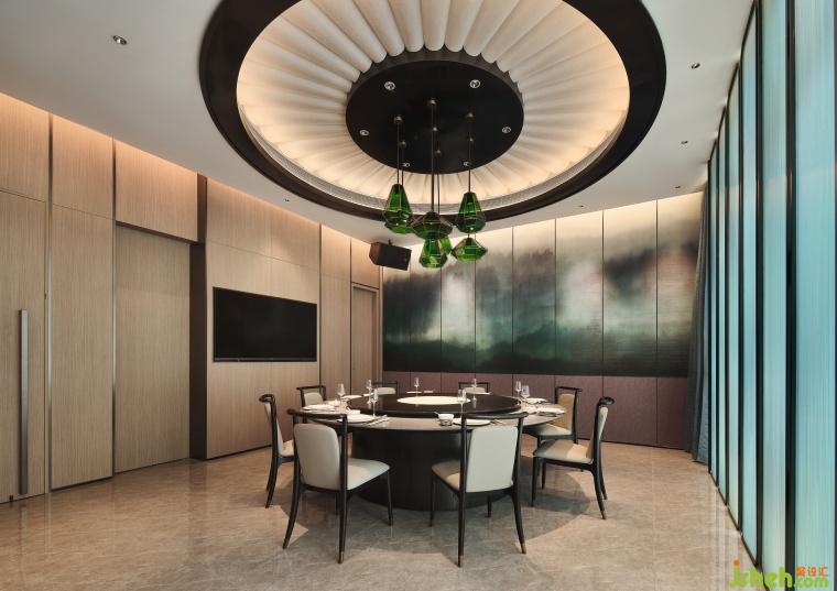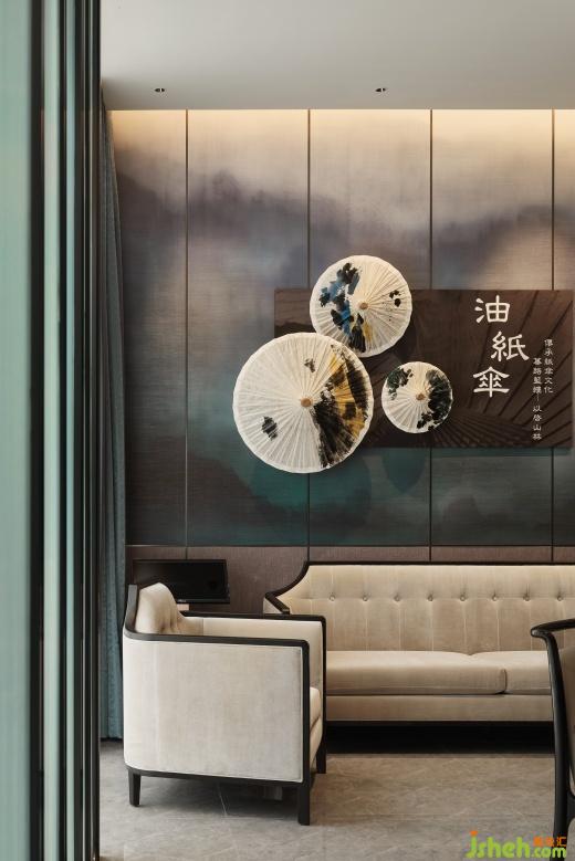 空間設(shè)計(jì)以油紙傘獨(dú)特的文化內(nèi)涵裝飾,傳遞吉祥、平安和團(tuán)圓的美好寓意,山林意象的壁布環(huán)繞空間,如置身于美濃寧?kù)o美好的自然風(fēng)光之中。圓形天花吊頂巧妙地采用了透光材質(zhì)的組合,營(yíng)造出傘面撐開(kāi)的視覺(jué)效果,在燈光下展現(xiàn)出溫潤(rùn)輕盈的光影效果。