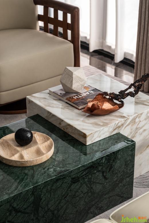 白紗輕撫,陽光漫入,淺白色軟皮沙發(fā)安靜輕盈,與大理石茶桌、人文古繪方幾互為加持,在層次上達到藝術的平衡。生活的愜意一經細細雕琢,締造出東方古意與現(xiàn)代美學的美美與共。