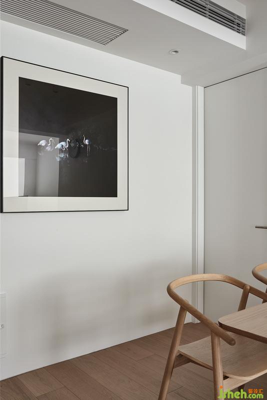空間留白是極簡設計中最常用的手法。此住宅墻面大面積留白,室內(nèi)設計師為了讓墻面顏色和地面顏色搭配更融合,舍棄了踢腳線,這樣整個空間看起來更為流暢。
