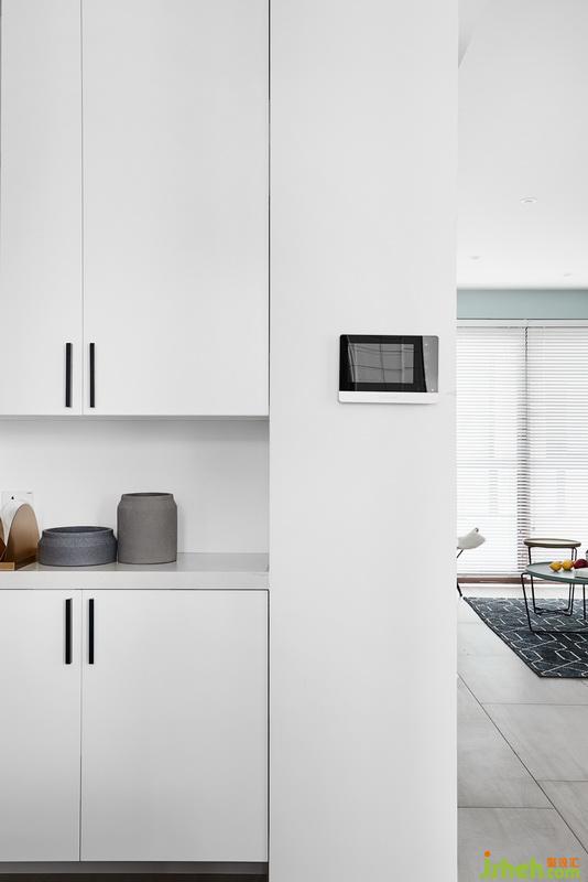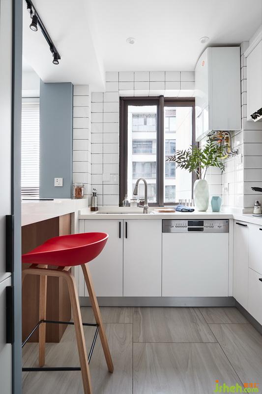小兩口不太做飯。平時工作也比較忙,但是非常熱愛火鍋,于是有了吧臺的設(shè)計,上面增加了電磁爐。效果上來說小戶型做開放式廚房也能極大提升空間感,弱化尺寸上帶來的局限性。
