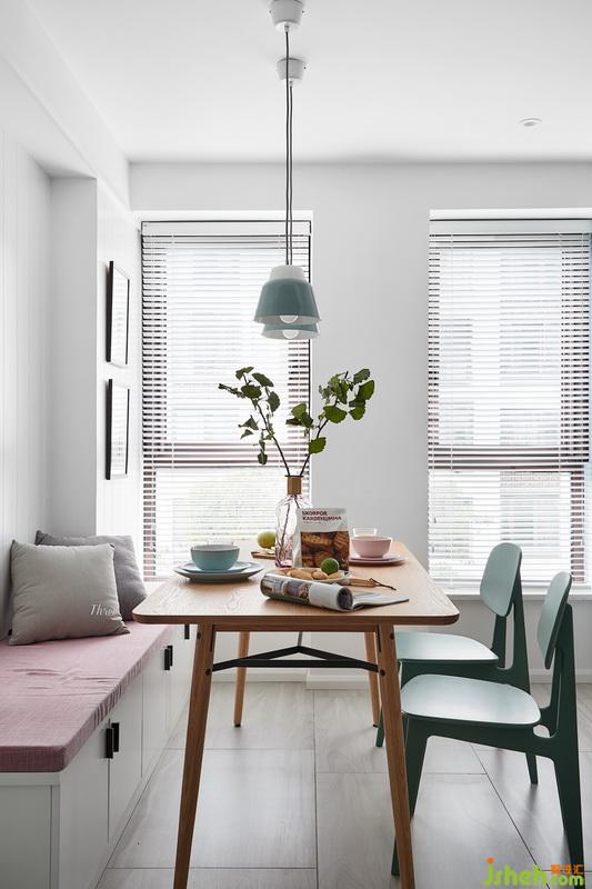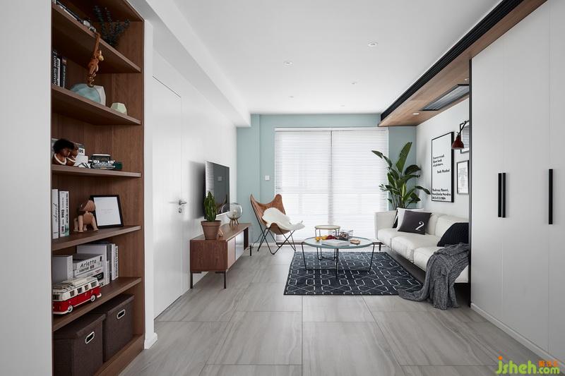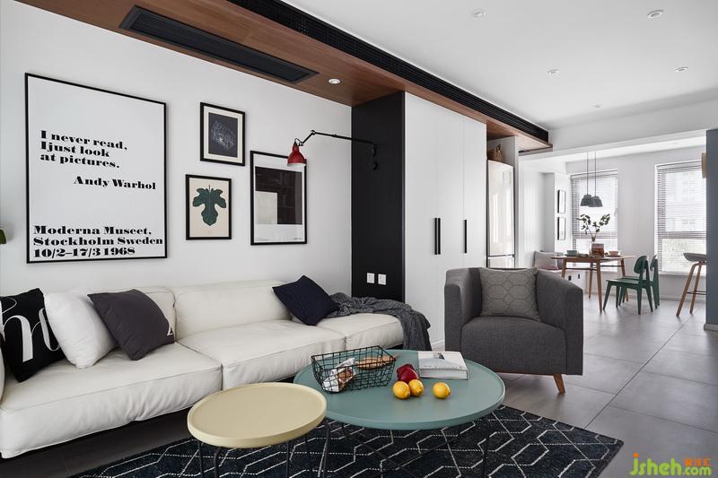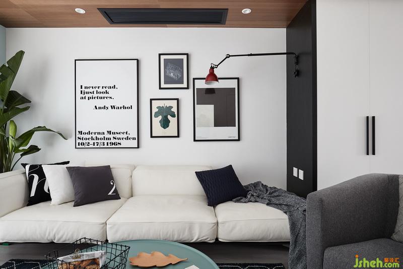 小兩口收養(yǎng)了一只流浪狗,寵物狗會在窗簾上撒尿,而且常規(guī)落地窗簾也會比較占空間,客廳對遮光性和私密性要求都不是很高,所以室內(nèi)設(shè)計師用了風格相對于不占空間,易于打理的百葉。 因為沒有安裝常規(guī)窗簾,所以通過墻面色彩不一 ,但是和家具軟裝呼應(yīng)讓空間更加有層次感