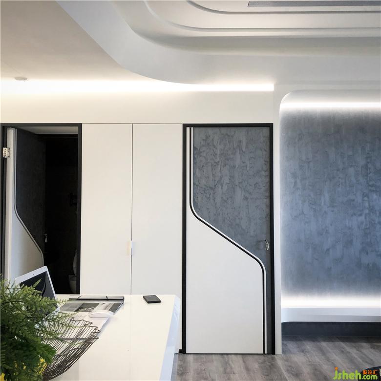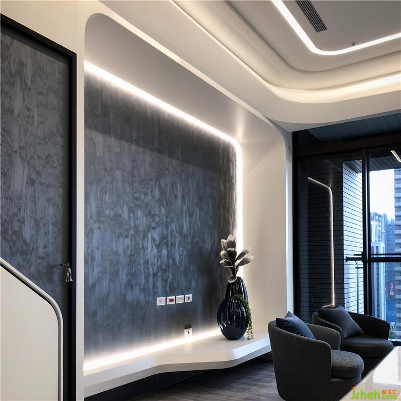 此案創(chuàng)造對於未來的想像,利用線性串連空間情感,打破現(xiàn)有限制。視覺上的錯覺往往可以產(chǎn)生比實際面積感官更大的效果。住宅普遍高度不高,直角也多,導(dǎo)致即使面積大卻仍感受空間小的結(jié)果。設(shè)計手法采用圓弧形的修邊來制造沒有死角的視野。前后錯位的天花造型在相對死板的空間產(chǎn)生了動感與流暢性。不拘泥現(xiàn)狀的設(shè)計適度的隱藏了過多的管線與結(jié)構(gòu)而達成空間的潔凈與單純。深藍色藝術(shù)漆賦予了整體空間一種時尚感??臻g里面雖然開放,區(qū)域性仍然存在。裝修公司