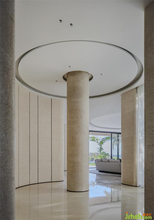 將柱子作為中心,別墅裝飾以水滴與漣漪進(jìn)行天花弧形擴(kuò)散的形式,從而形成視覺焦點(diǎn)在空間的表達(dá)邏輯。就像水滴落入水面時產(chǎn)生的漣漪一樣,這種設(shè)計不僅將視線引導(dǎo)到空間的中心,還能夠在整個空間中營造出一種流動的美感,增強(qiáng)人們的空間體驗(yàn)。