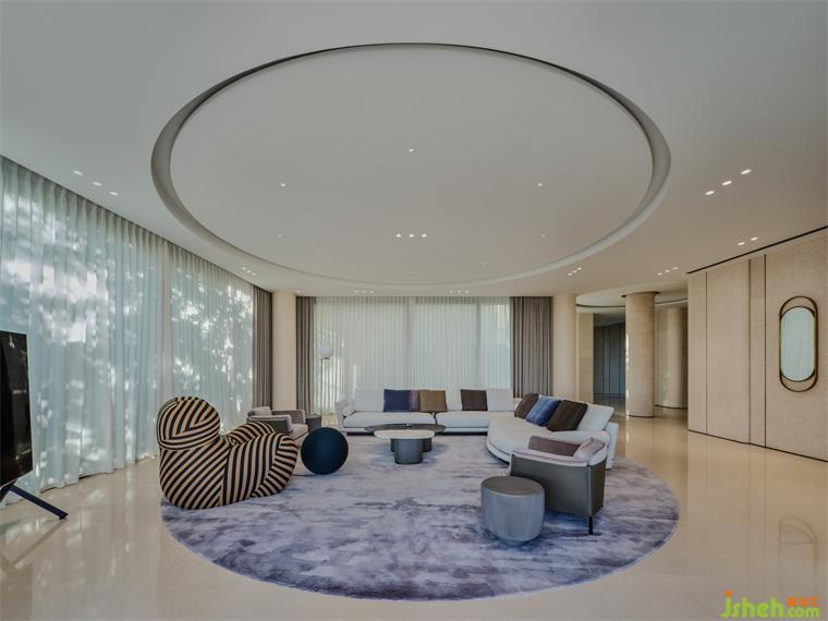 溫潤的大地色系透露著恬淡的熨帖與靜謐的暖意,搭配線條與幾何結(jié)構(gòu)延伸活力的流線,簡潔的語匯給人柔和的熟悉感,圓角牆線形塑出流淌躍動的空間,圓形天花的中心圍合營造出舒適和親密的氛圍。它將人們聚焦在客廳的中心??蛷d的家具和布置與圓形天花相呼應(yīng),進(jìn)一步強(qiáng)調(diào)中心圍合的感受。這種設(shè)計邏輯不僅為空間增添了獨(dú)特的美感,還為人們提供了一個溫馨而聚集的空間,促進(jìn)了家人和朋友之間的交流和互動。