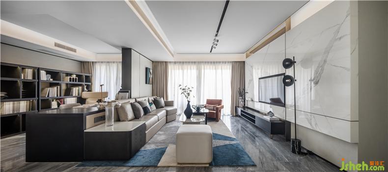 客廳運(yùn)用黑色的細(xì)小線(xiàn)條與大面積柔和的木飾面、大理石的考究比例劃分,結(jié)合開(kāi)放式的書(shū)房,就像透過(guò)穿梭于香港與內(nèi)地的男主人其鏡頭,記錄下最具代表性的影像,進(jìn)而通過(guò)藝術(shù)空間藝術(shù)手法的拼接,樣板房設(shè)計(jì)成為獨(dú)特視角,體現(xiàn)了兩地的緊密聯(lián)系與蓬勃發(fā)展的時(shí)代脈搏