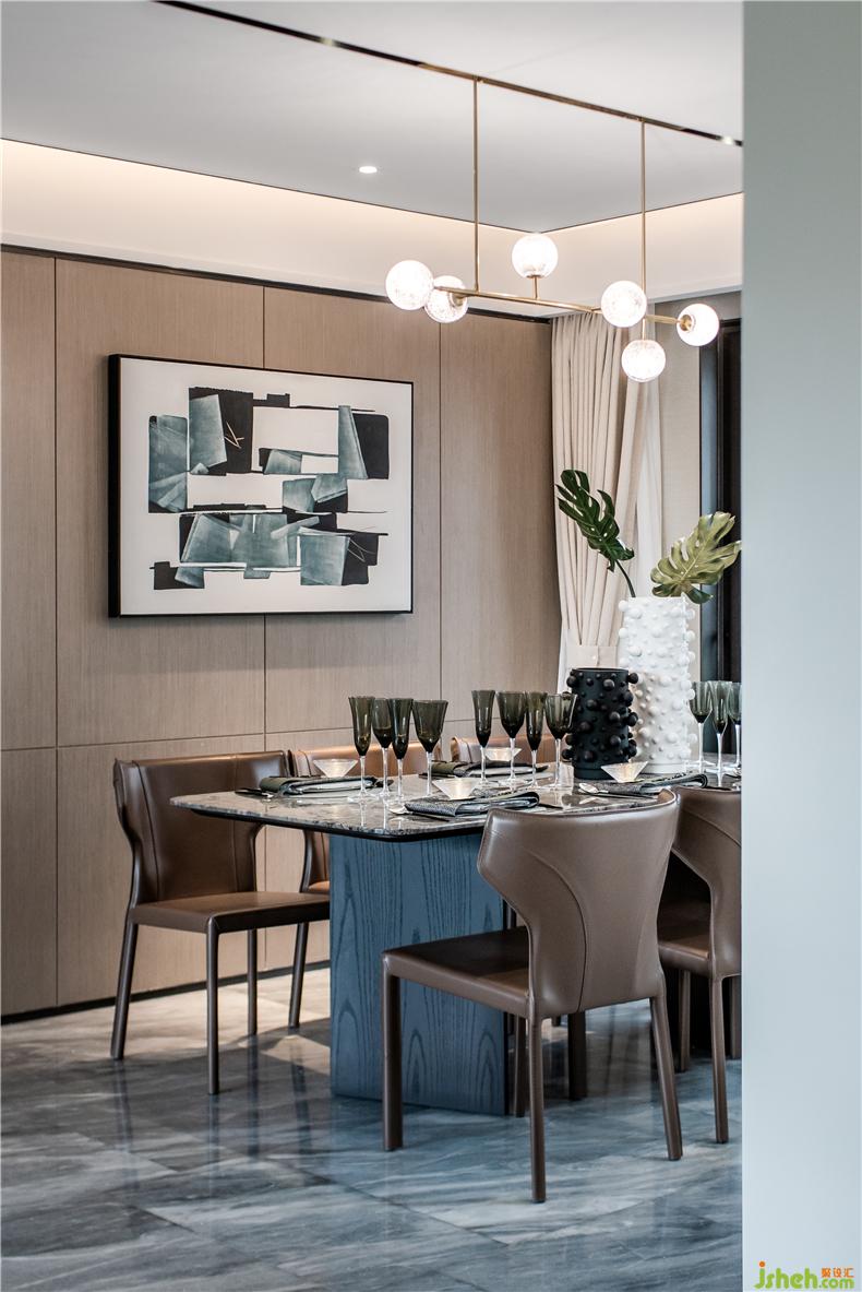 開(kāi)放式式餐廳與廚房的巧妙連接,讓空間變得更靈動(dòng)。樣板房設(shè)計(jì)大理石材質(zhì)的餐桌帶來(lái)的質(zhì)感與皮質(zhì)餐椅,形成一剛一柔的對(duì)比與碰撞