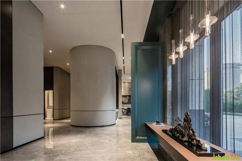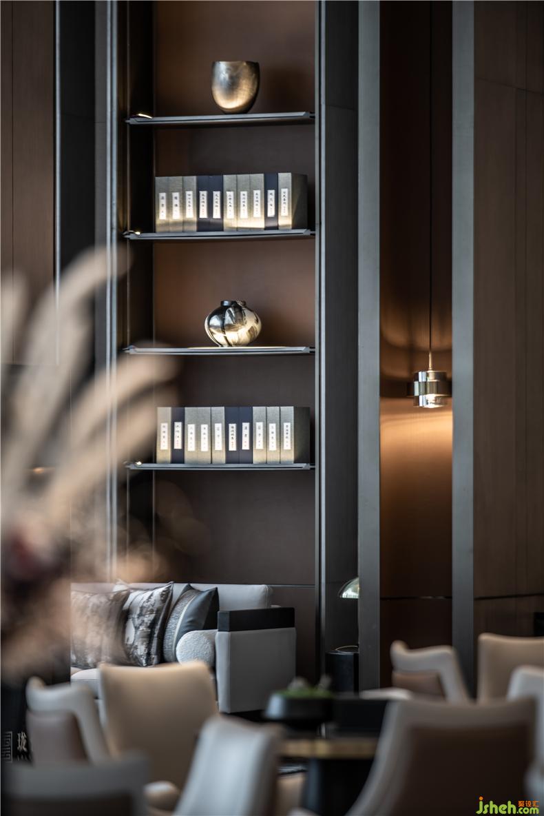 金屬吊燈柔和的暖光從弧形墻壁蔓延開,如圓月在水中蕩漾開的水波,讓這一隅更添一絲靜謐。