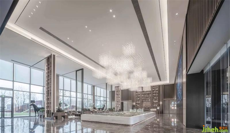 金屬線條穿插、交疊,形成立體的網(wǎng)格狀吊燈,將數(shù)學(xué)的理性嚴(yán)謹(jǐn)美具象化。遠(yuǎn)看云霧般的鏤空設(shè)計(jì)將視覺(jué)引向更遠(yuǎn)方,呈現(xiàn)出“山色入城秋”的美感,也暗承西安古城的歷史文化淵源。