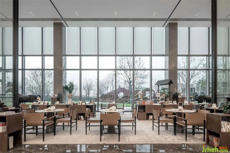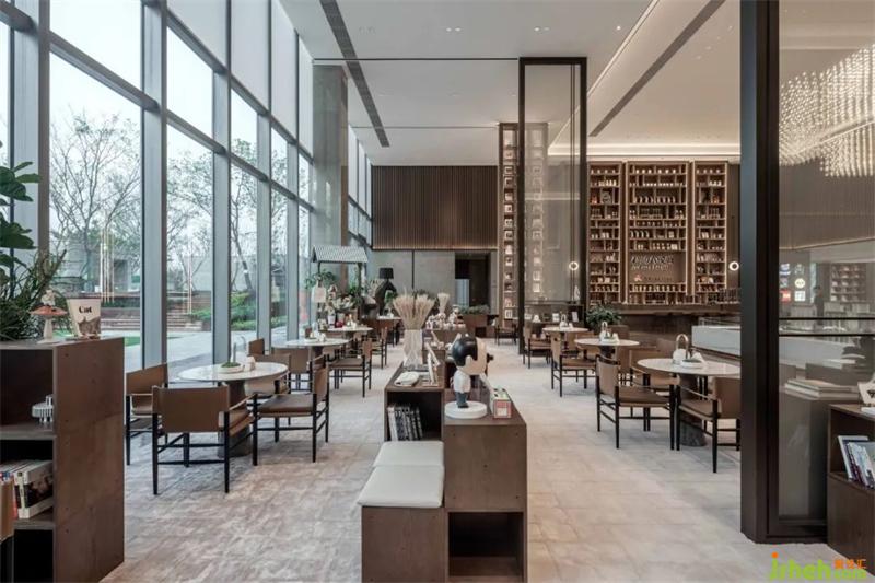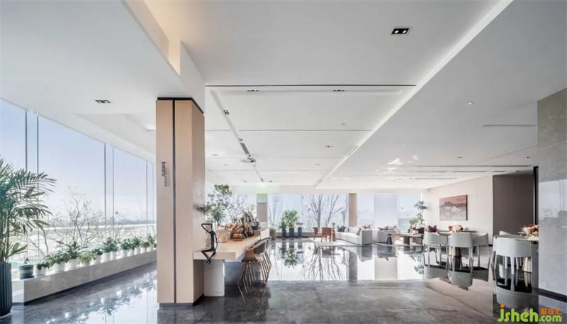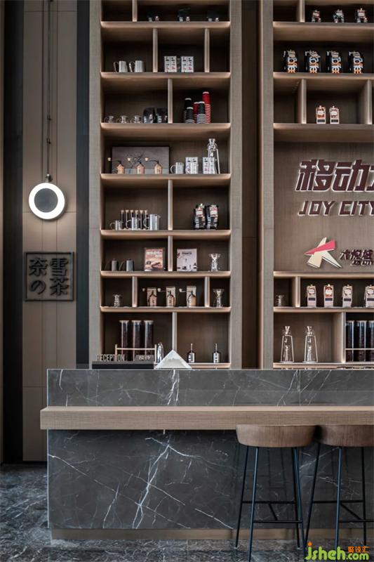水吧區(qū)渾厚的木飾面板在墻面上縱橫,簡(jiǎn)約的線條與面描摹出現(xiàn)代空間的藝術(shù)感。售樓處設(shè)計(jì)木飾面的溫暖細(xì)膩與銀河灰石材的冷靜理性互相存托互相成就,整個(gè)空間秩序井然大氣得體。