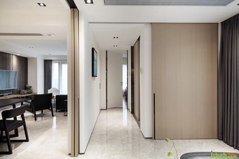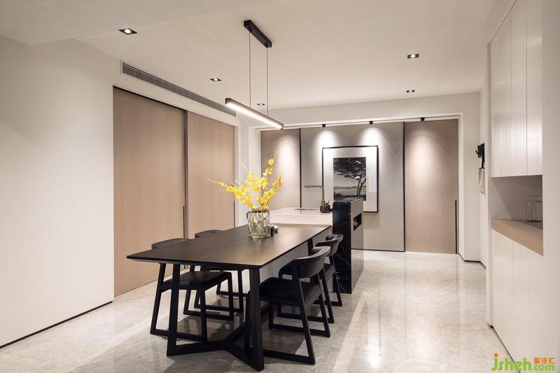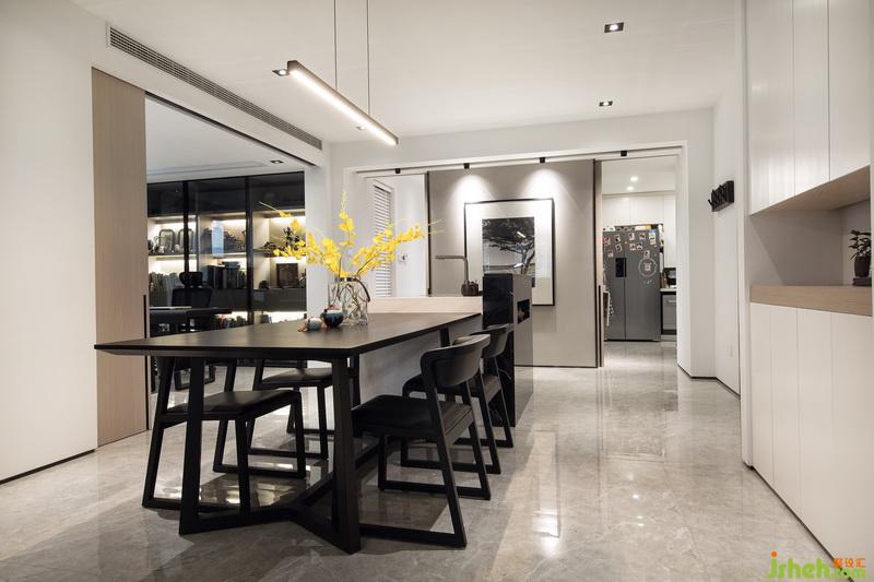 經(jīng)過室內(nèi)設(shè)計師的巧妙規(guī)劃,原本客廳和書房的位置對調(diào),使客廳餐廳在同一動線上,利用移門這種班隔斷的形式,將書房和客餐廳公共區(qū)域進(jìn)行有效的劃分,空間避免了使用過多的元素造成的雜亂感,在材質(zhì)和顏色的選擇上比較整體同一,簡潔大氣。