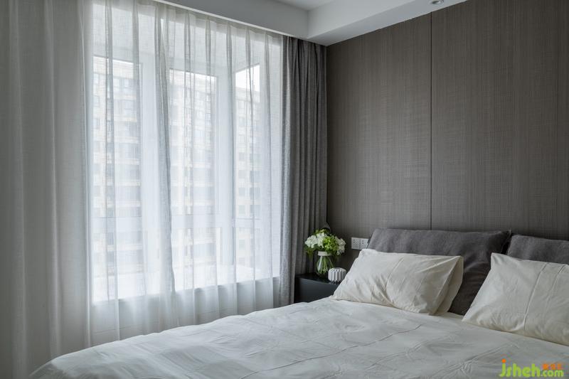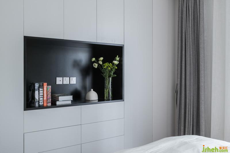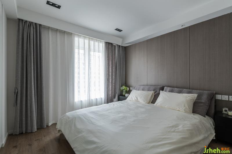 主臥無論是色彩還是材質(zhì)都延續(xù)了整體低調(diào)且質(zhì)感的風(fēng)格,電視背景墻區(qū)域做了一整排的儲(chǔ)物柜,保證了足夠的儲(chǔ)物空間,搭配深色的木地板,營造舒適的休息空間。