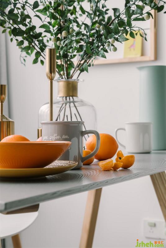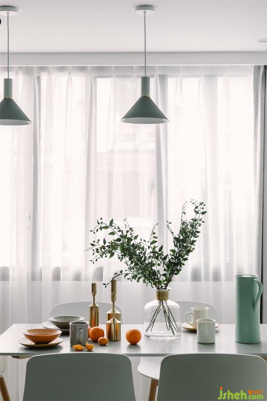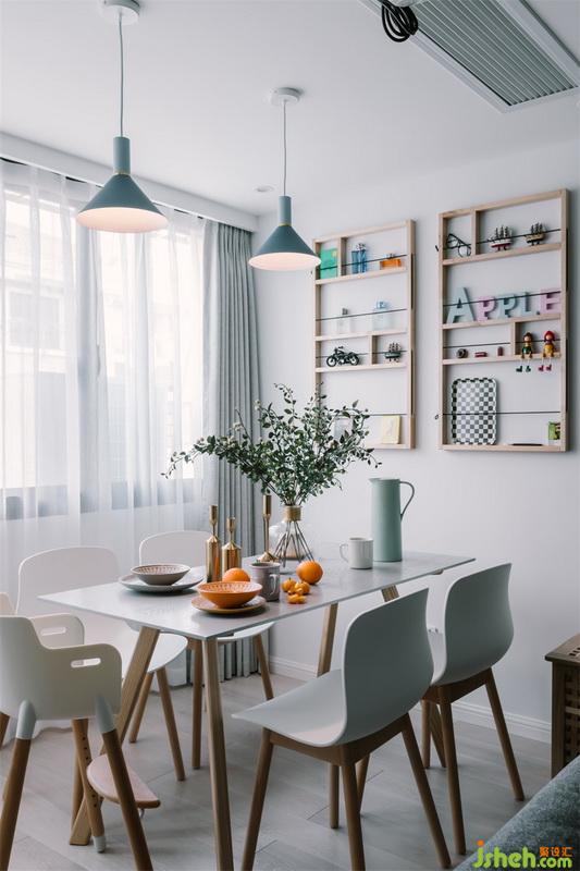設(shè)計(jì)公司用開放式的客餐廳設(shè)計(jì)為小空間帶來更為通透靈活的視覺感受,輕巧的餐桌椅搭配淺藍(lán)色的吊燈,展示架以溫柔的木元素搭配精致趣味的一些飾品,塑造出輕盈舒服的感受,墻面上綠色的黑板漆為這里更添一抹優(yōu)雅,營造出質(zhì)感氣息。