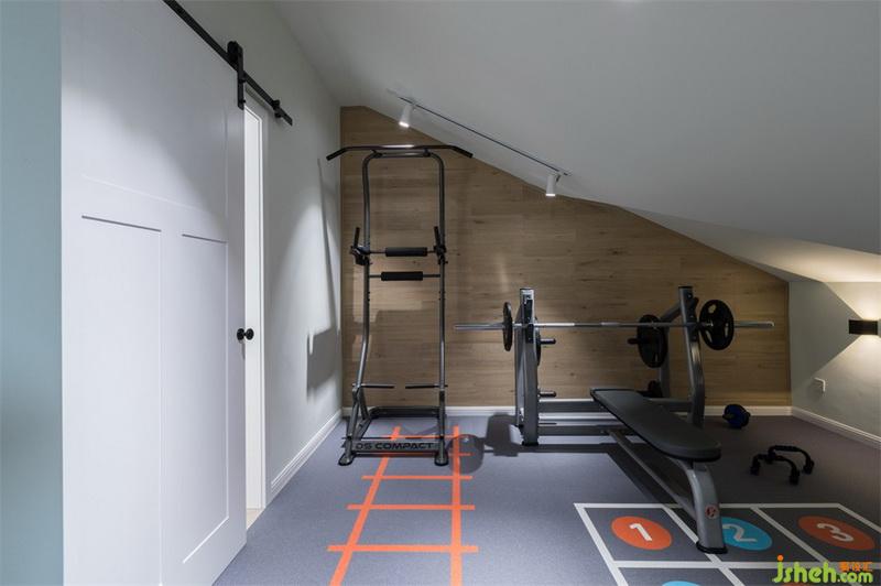 二樓專門留有當(dāng)作健身活動的空間,地板上墻,地面設(shè)計(jì)公司采用地膠的涂刷方式,營造出平靜積極的氛圍。