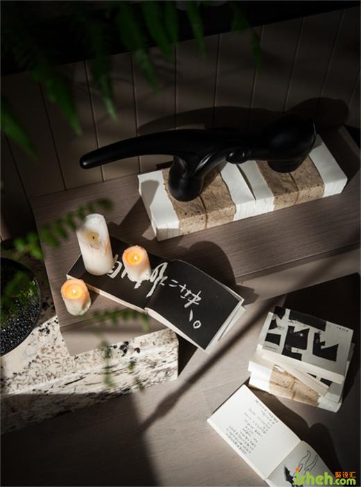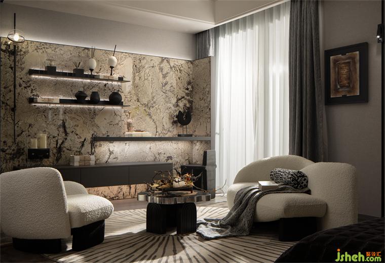大理石背景墻以其自然獨特的紋理襯托著空間的高雅格調(diào),濃淡相宜的一支綠、一抹黃、抽象藝術(shù)掛畫、淡雅瓷器等使得空間格調(diào)更圓滿,仿佛這是東方文人雅士的愜意居所。在此空間,設(shè)計師以獨特、松弛有度的手法使得空間在東方雅與現(xiàn)代的交融下,濃厚的藝術(shù)文化底蘊在此空間舒展、蔓延,這是一個精神與美學(xué)并驅(qū)的空間。