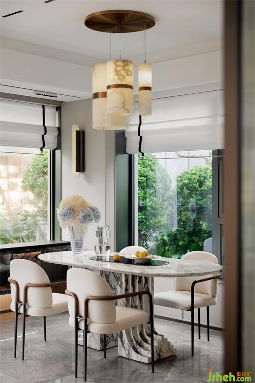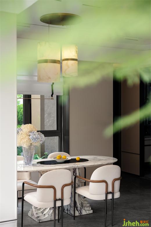 餐桌采用了斯卡帕的設(shè)計(jì)手法,層層疊疊的精細(xì)打磨,樣板間設(shè)計(jì)幾何形狀與天然石材融為一體彰顯家的細(xì)致品味,古典而極具現(xiàn)代感。