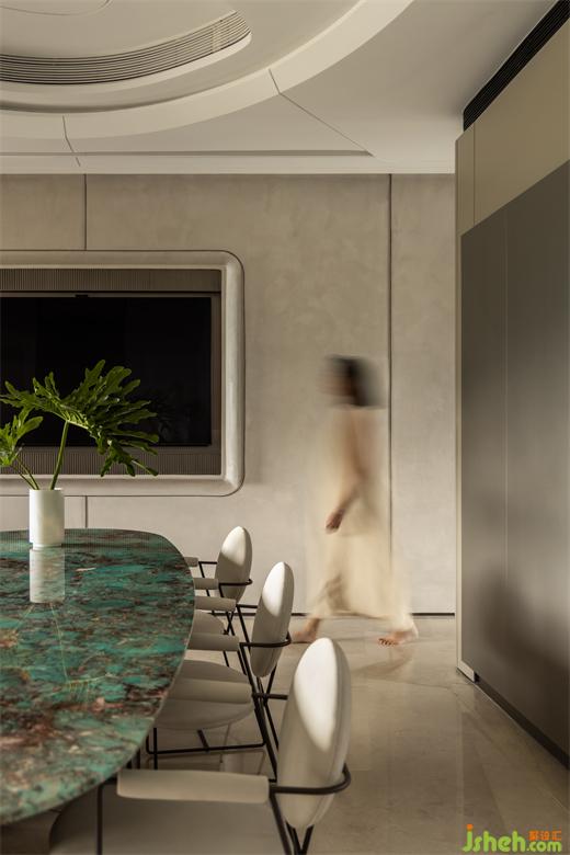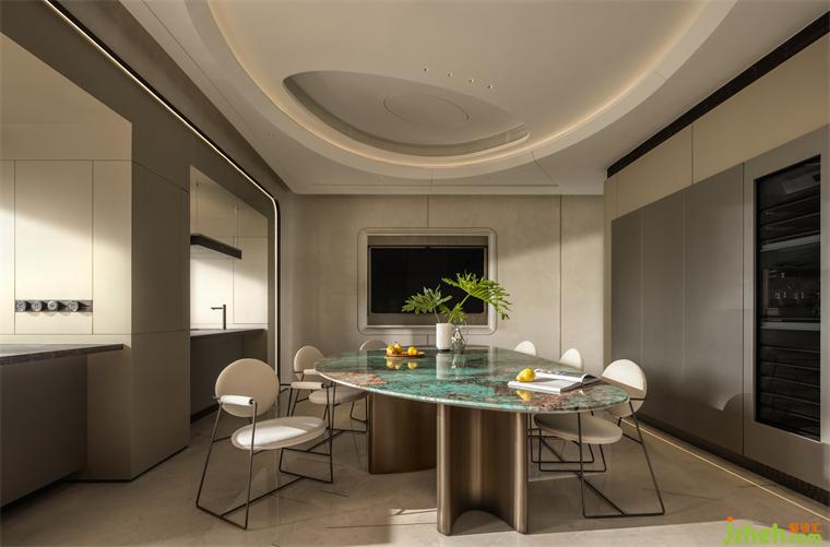 三亞私宅設(shè)計(jì)將餐廳布局在南面,搭配亞馬遜綠石打造3.2×1.5米長(zhǎng)的餐桌,海藍(lán)色調(diào)的石材呼應(yīng)山海的翡翠光輝,讓每一次相聚都是欣喜的際遇。