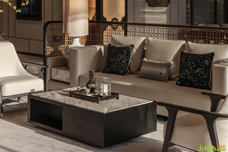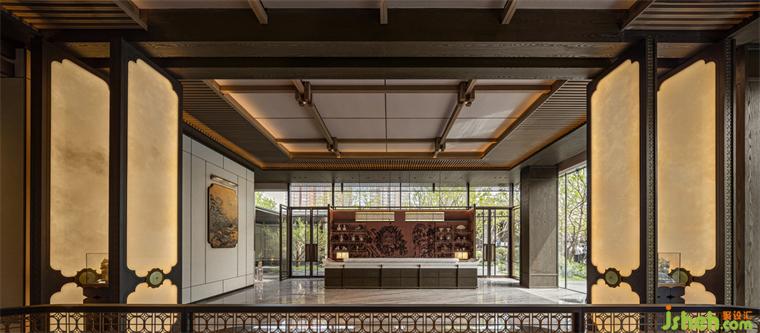 營銷中心設(shè)計對稱均衡的空間布局與古都中軸線交相輝映,黑木以翠綠如玉的石紋點綴,暖光映襯下,盡顯溫潤文雅之風。