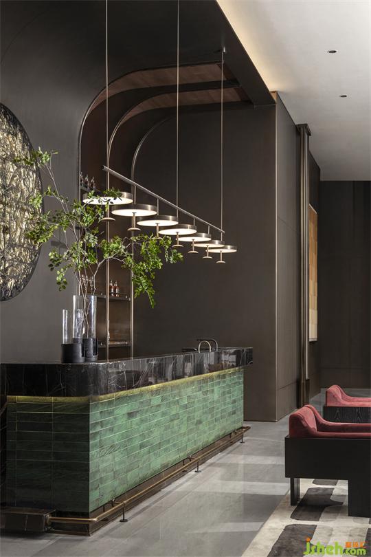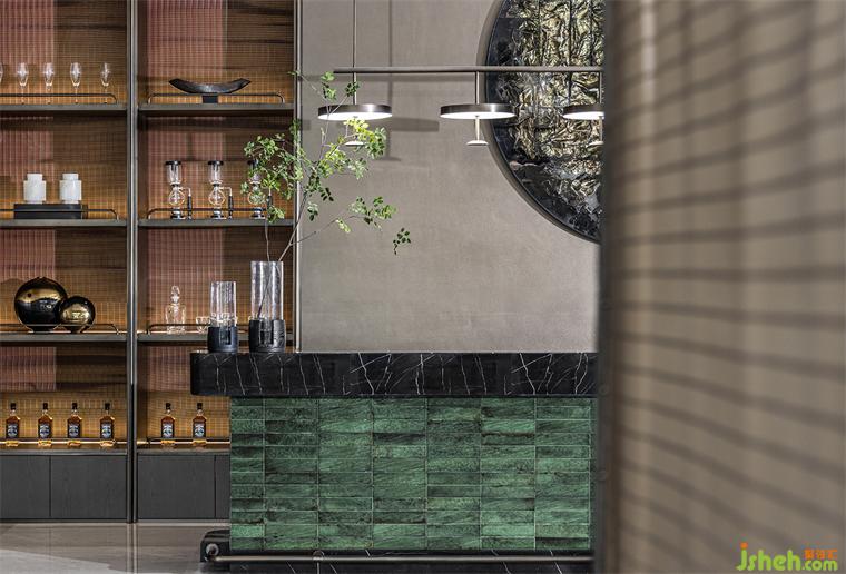 水吧主材提取了當(dāng)?shù)劓闹莞G的工藝及色彩打造的手工磚,金屬網(wǎng)與古銅色層板,售樓處設(shè)計(jì)用材質(zhì)的肌理營(yíng)造多元、多層次造型,傳統(tǒng)技藝與當(dāng)代審美在此相融相生,散發(fā)出新生的力量。