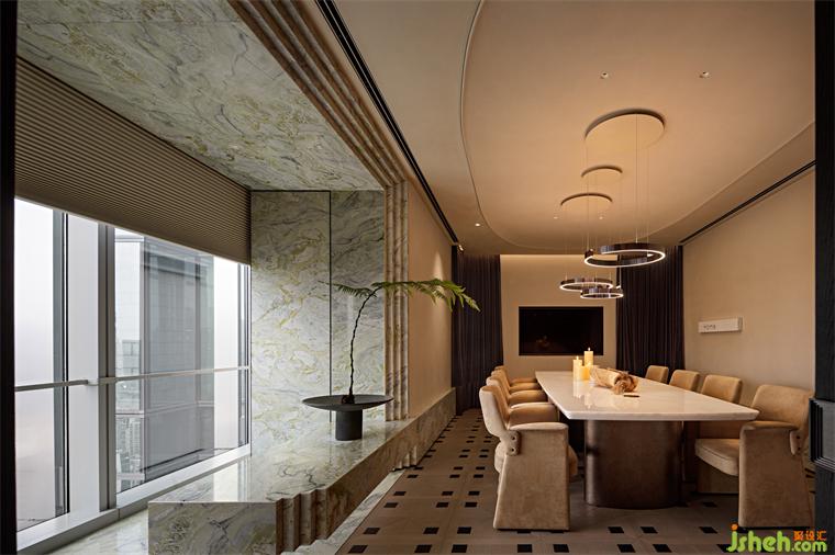 VIP私宴區(qū),私密性和開(kāi)放性兼具,視線的主角是透過(guò)翡翠綠大理石飄窗外的城市天際。展示空間設(shè)計(jì)淺色地板與黑色地板拼成的優(yōu)雅拼花經(jīng)典溫潤(rùn),是一種記憶與當(dāng)下的交織和碰撞,形成一種語(yǔ)言的豐富性和張力。學(xué)術(shù)研討會(huì)、商務(wù)會(huì)談、私宴等活動(dòng)輪番上演,溝通在這里自然發(fā)生,創(chuàng)造無(wú)限可能性。