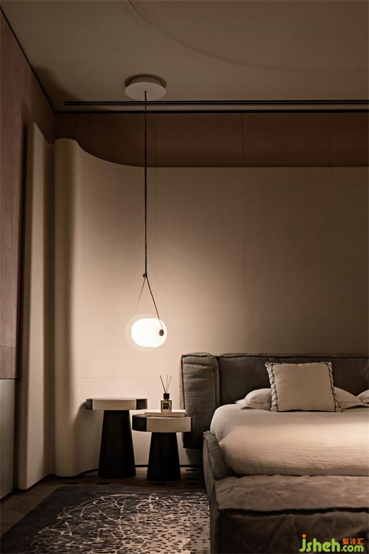 粉色絨面皮結(jié)合畫(huà)軸造型的米白色絨布材質(zhì)的床背景,讓空間保留圍合的同時(shí),可以自由呼吸。燈的光暈折射在鍍鋅鋼板上,使情緒隨視線自然流轉(zhuǎn),空間的層次和厚度給人一種舒適的包裹感。